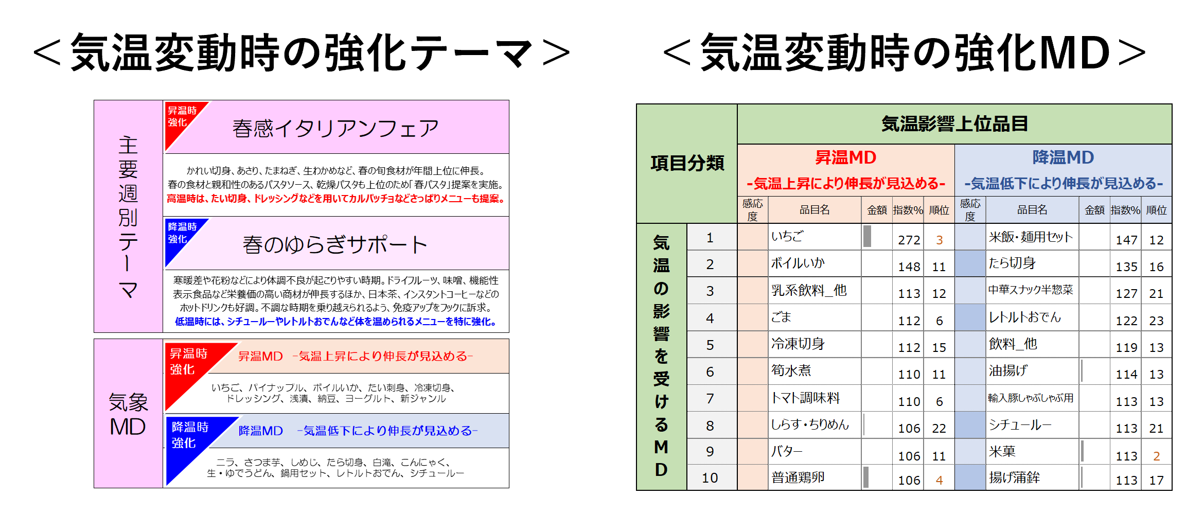 ❷気象感応度をベースとした、例年より昇温時・降温時の際の強化テーマ・MDを可視化