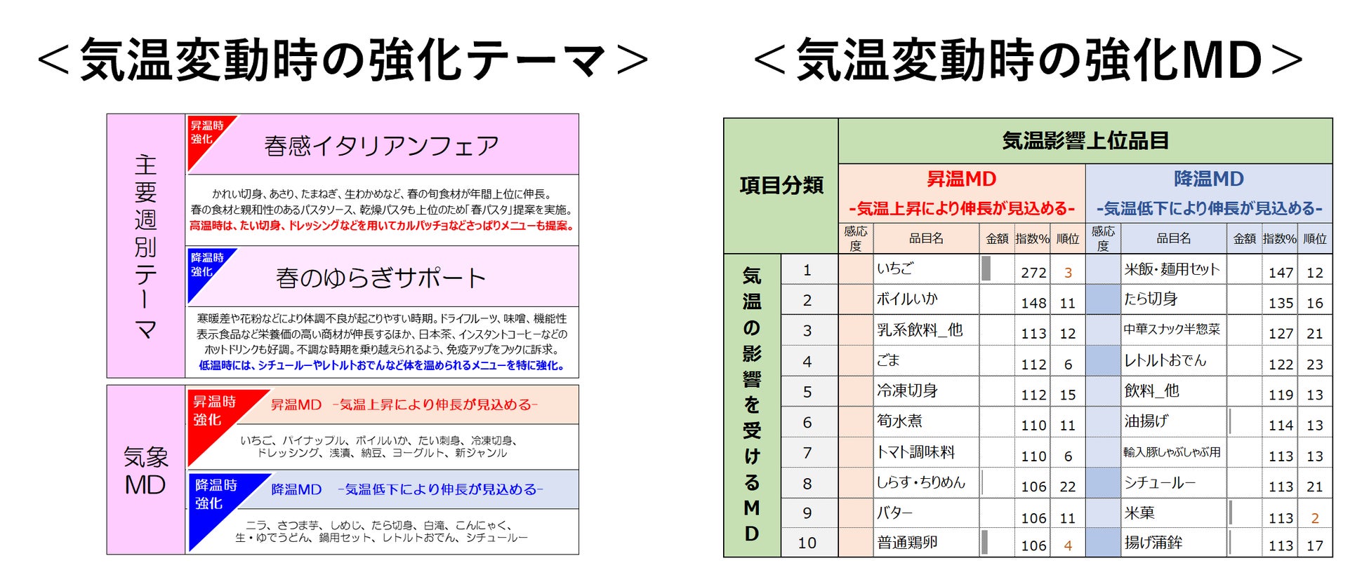 日本気象協会協力のもと、2021~2024年のPOSデータ実績の気象感応度を解析することで、「気温が上がれば売れる昇温MD」「寒くなるほど売れる降温MD」を抽出しました。