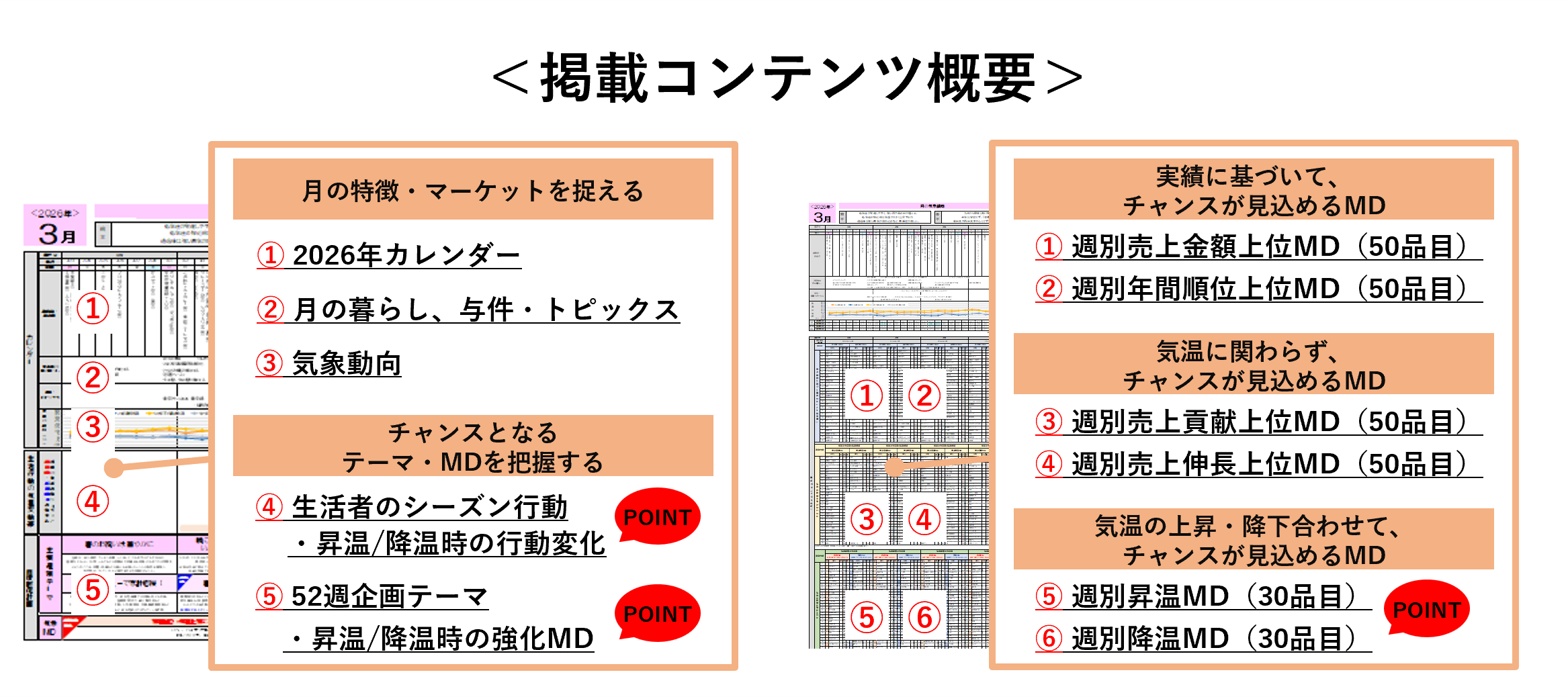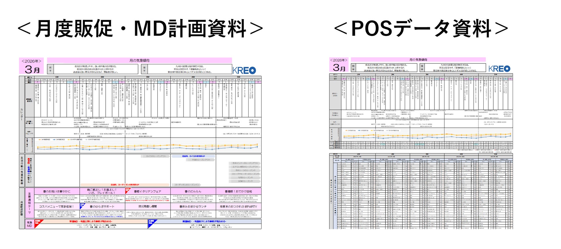 気象MDカレンダーは、月度販促・MD計画資料とPOSデータ資料の二部構成にてご提供し、お客様の目的・課題に合わせて活用頂けます。月度販促・MD計画資料はA4サイズ横型、POSデータ資料はA3縦型のExcelテンプレート形式で提供し、現場や会議ですぐに活用できる設計となっています。