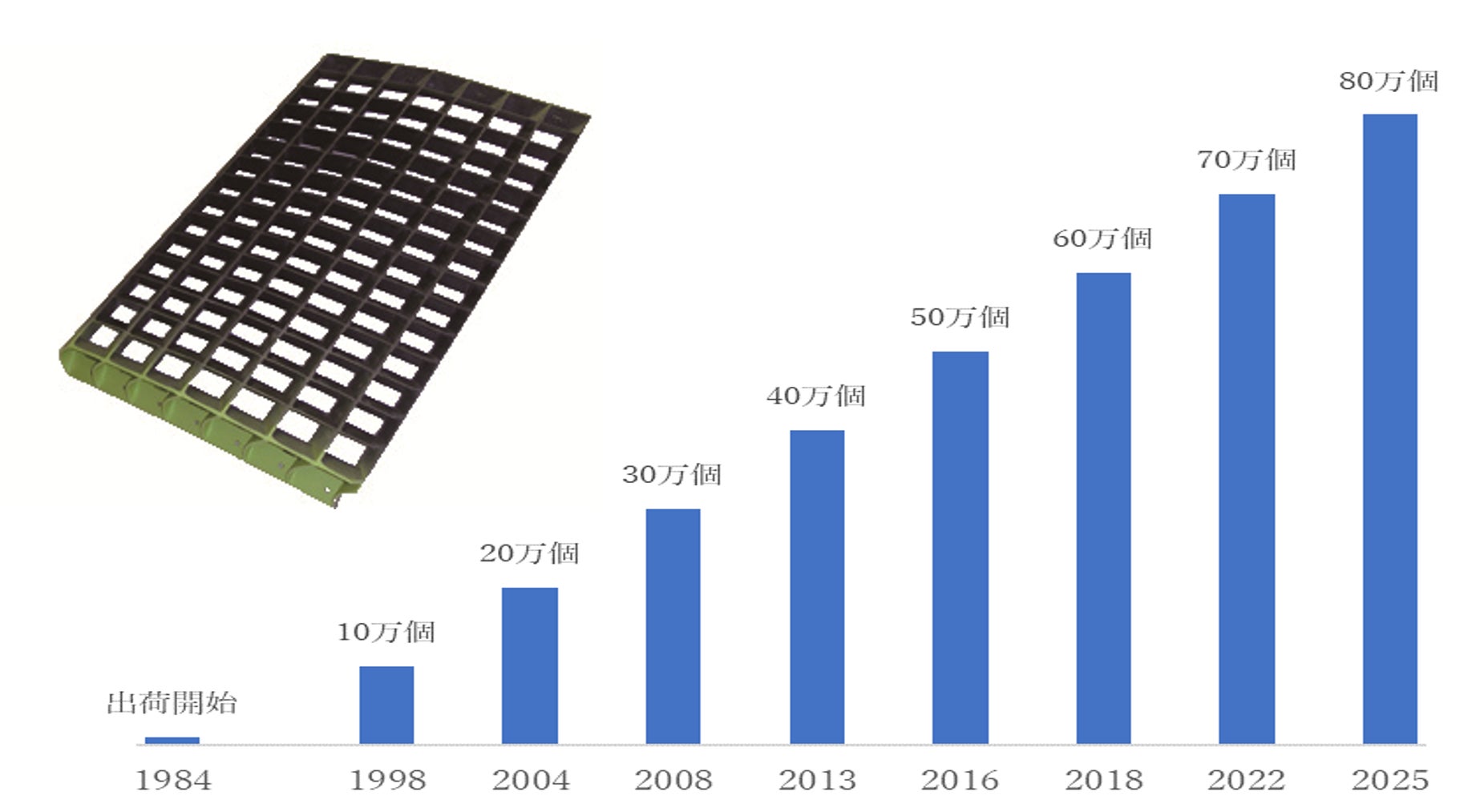 日機装は米ロアー社(現RTX社)から打診を受けて、1983年に世界で初めてCFRP製カスケードの開発に成功。翌年、米国連邦航空局(FAA)の認証を取得し、初出荷しました。軽量・高強度なCFRP製カスケードは、その燃費改善性と壊れにくさから、大型機を中心にアルミ製から徐々に置き換えられ、1998年に出荷10万個を突破しました。