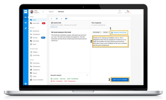 responseAIは、AI技術を活用し、ゲストから個別に届くクチコミの文脈に即した返信コメント(テキスト)を自動生成します。ホテルとクチコミ投稿者の名前を認識するテクノロジーにより、好みのトーンや文字量で返信コメントを作成することができ、クチコミの言語に基づいて自動翻訳(140言語以上)もします。また、施設特有のクレームやお褒めの言葉に対する返信方法をresponseAIに学習させることも可能です。それにより、宿泊施設のクチコミ管理担当者は、ゲストから届く様々なクチコミコメントに迅速に返信、回答することができ、施設からの返信コメントを待つゲスト(クチコミ投稿者)の待ち時間も短縮します。