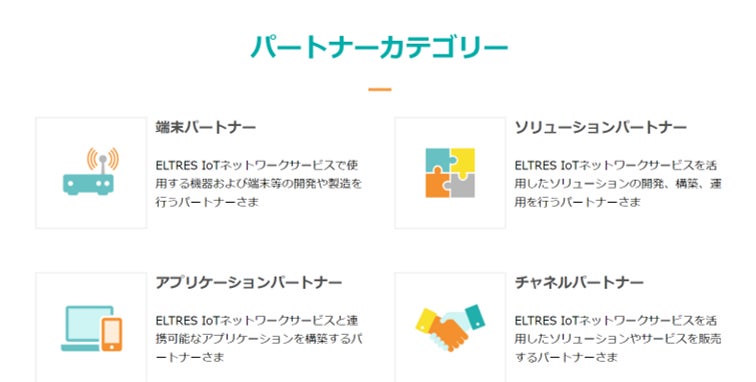 パートナープログラムは、「ELTRES IoTネットワークサービス」を活用してビジネス展開を考える企業向けに4カテゴリ(ソリューション、チャネル、アプリケーション、端末)を用意しています。参画企業はソニーネットワークコミュニケーションズからELTRESサービスの情報提供、プロモーションの協力、パートナー企業同士のビジネスマッチングに対してサポートを受けることができます。