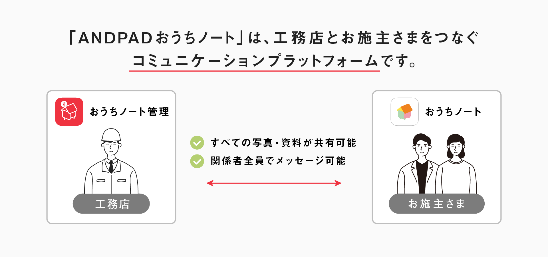 「ANDPADおうちノート」は、建築中の進捗を施主に共有することはもちろん、契約前の提案・打ち合わせや引き渡し後のアフター管理まで工務店と施主のコミュニケーションを一元管理することで施主満足度向上に寄与します。
