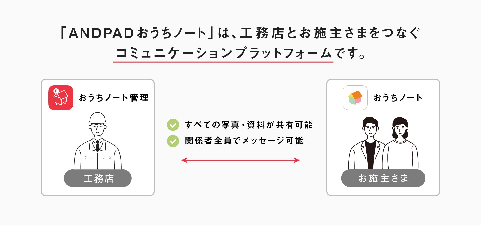 ※ 「ANDPADおうちノート」は、「施主報告」機能をリニューアルした新しい製品です。ご利用には別途ご契約が必要になります。現在「施主報告」機能をご利用の皆さまは、現行の機能を継続してご利用いただけます。