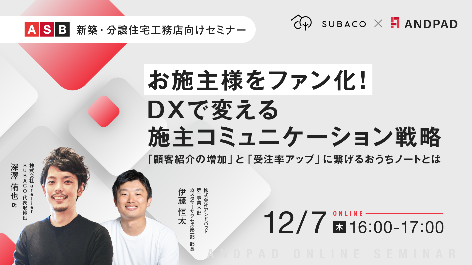 また、お施主さまのファン化に成功している工務店 atelierSUBACO 様にもご登壇を頂き、具体的な取り組み内容についてもご紹介いたします。