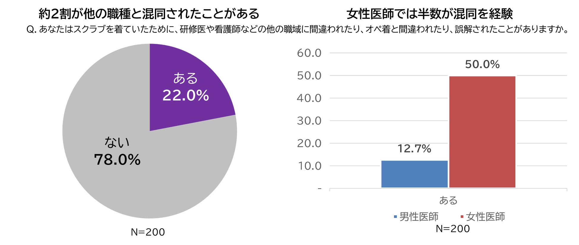 スクラブを着ていたために、研修医や看護師などの他の職域と混同されたり、オペ着と間違われたりしたことがあるかどうかを聞いたところ、あると回答した人は約2割(22.0%)に上りました。特に男女別でみると、女性医師は半数(50.0%)が経験していることがわかりました。検査技師、リハビリスタッフ、理学療法士など様々な職種の声が上がりましたが、中でも看護師と混同されやすいとの声が多くありました。医師と看護師では役割が異なるため、患者とのコミュニケーションの齟齬が起こってしまい、診察・回診時に支障が出たとの経験談が寄せられています。スクラブが職種の判断基準にならないことが世間一般に浸透される必要があると考えられます。
