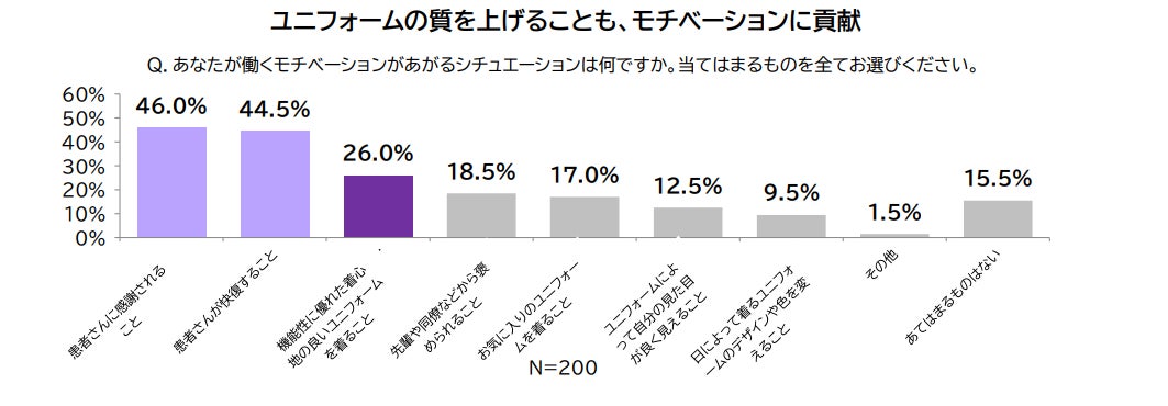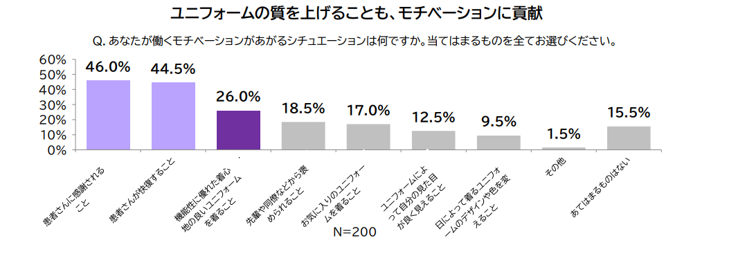働くモチベーションのあがるシチュエーションについて聞いたところ、「患者さんに感謝されること」「患者さんが快復すること」に続いて「機能性に優れた着心地の良いユニフォームを着ること」が3位に挙がりました。本調査の結果からも、勤務の快適性を高める一要素であるユニフォームを、機能性とデザイン性の両方が揃ったものに整えることの重要性は高いと考えられます。