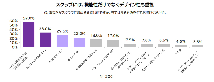また、スクラブに求める要素について聞いたところ、上位には「汗をかく環境でも快適な通気性・速乾性」「体にフィットするデザイン」「汚れの落ちやすさ」「ポケットの多さ」などが挙がりました。着心地の良さが前提としてありつつ、機能性だけでなくデザイン性についても同等に重視する意向が強いことが伺えます。