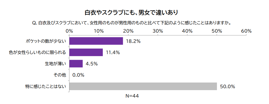 白衣およびスクラブにおいて女性用のものと男性用のもので違いを感じたことがあるか女性医師に聞いたところ、女性医師の半数(50.0%)があると回答。「体のラインが出やすいフォルムである」「ポケットが浅くて物が入らない」「ポケットの数が少ない」など、同じスクラブであっても実は違いがあり不便さに繋がっている一面もあることが分かりました。