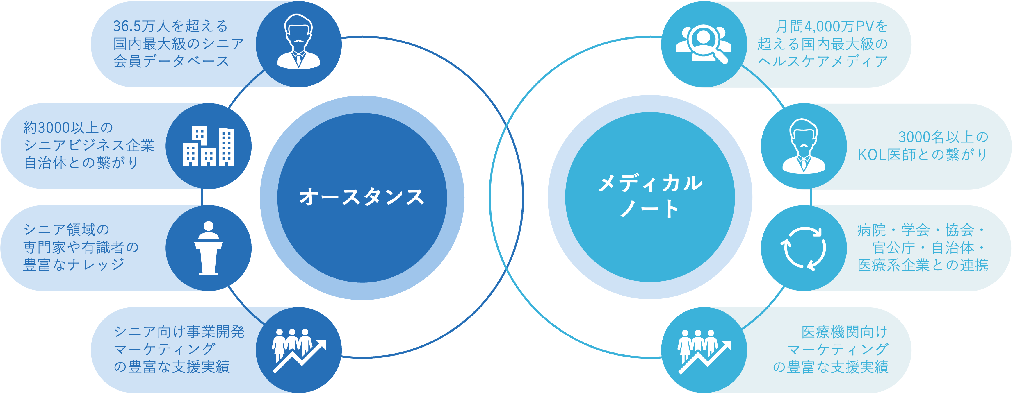 メディカルノートが保有している医療ナレッジや、医療検索のデータベースによる知見と、オースタンスが保有しているシニア世代を行動変容させるナレッジや、会員データベースによる知見、それぞれのナレッジとデータベースの連携を行います。その結果、高齢者×医療領域において最適なアプローチを提供します。