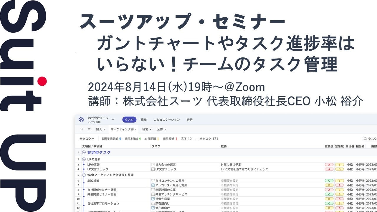 株式会社スーツ(所在地:東京都千代田区、代表取締役社長CEO:小松 裕介)は、2024年8月14日(水)19時から、当社代表の小松が講師を務めるスーツアップ・セミナー「ガントチャートやタスク進捗率はいらない!チームのタスク管理」を無料開催します。