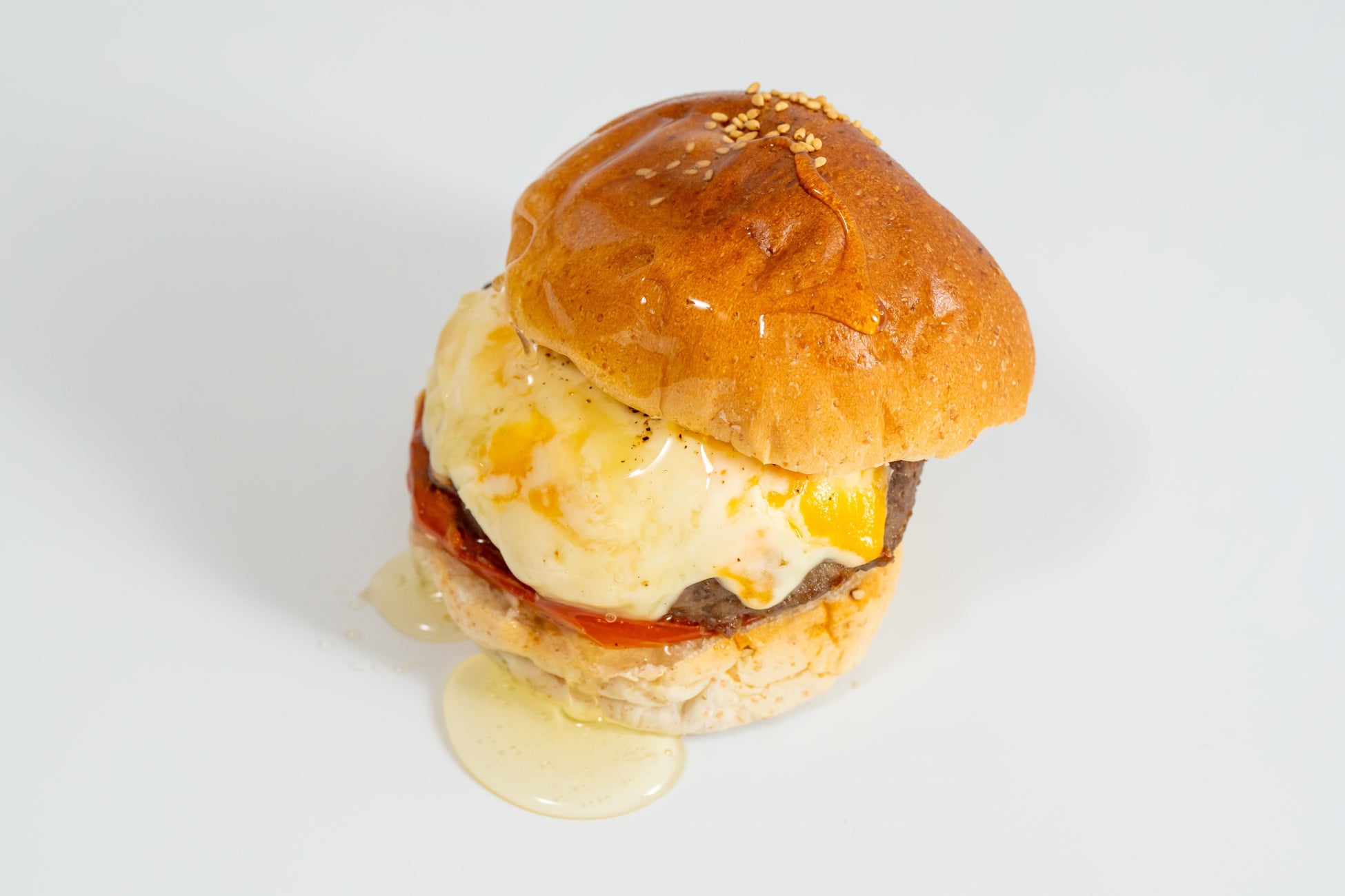 チェダーチーズ・ゴーダチーズ・リコッタチーズ・ブルーチーズと4種のチーズを贅沢に使用したクアトロチーズのクイーンバーガー。チーズのうま味をしっかりと感じられるようレタスなどは入れず最低限の具材に。濃厚でリッチな味わいを楽しんだあとはお好みで別添えのハチミツをかけて2度楽しんで。