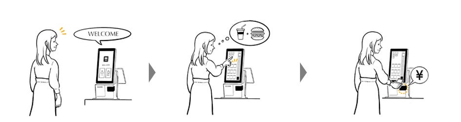 「キオスクオーダー(セルフレジ)」は、タッチパネル式のキオスク端末の画面に表示されるメニューからお客さまがオーダーします。対応する決済サービスを選択して決済すると、受付番号が発券されます。オーダー商品ができると、飲食売店内のディスプレイに受付番号が表示されます。