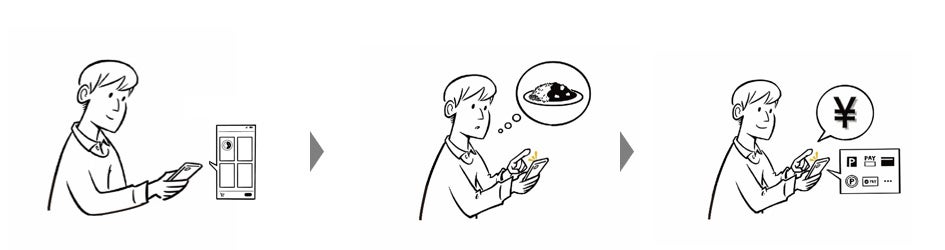 「モバイルオーダー」は、飲食売店に掲出するQRコードをお客さまのスマホで読み取り、メニューを確認の上、オーダーします。決済手段を選択し、決済が完了すると、スマホ画面に受付番号が表示されます。オーダー商品ができると、スマホに通知と、飲食売店内のディスプレイに受付番号が表示されます。