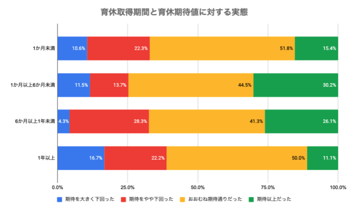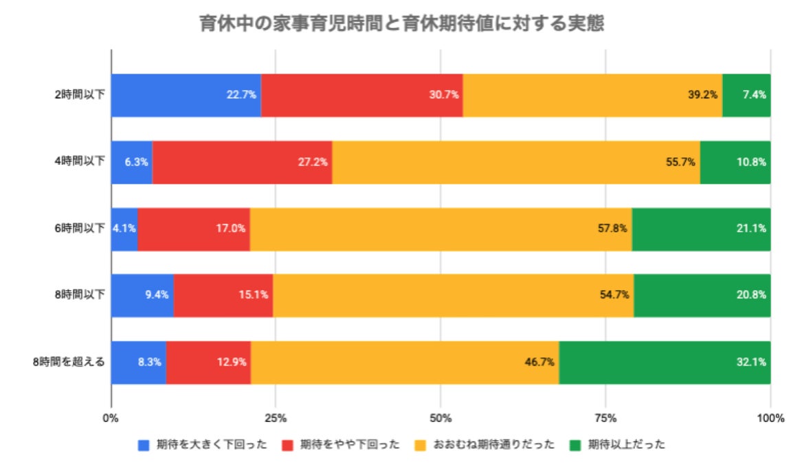 「期待以上だった」という回答率が最も高く、3割超えだった家事育児「8時間以上」の家庭は、「2時間以下」の7.2%と大きく差が開き、期待を下回る割合が高いのも男性の家事育児時間が低い家庭であることもわかりました。
