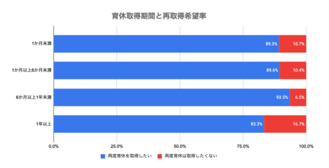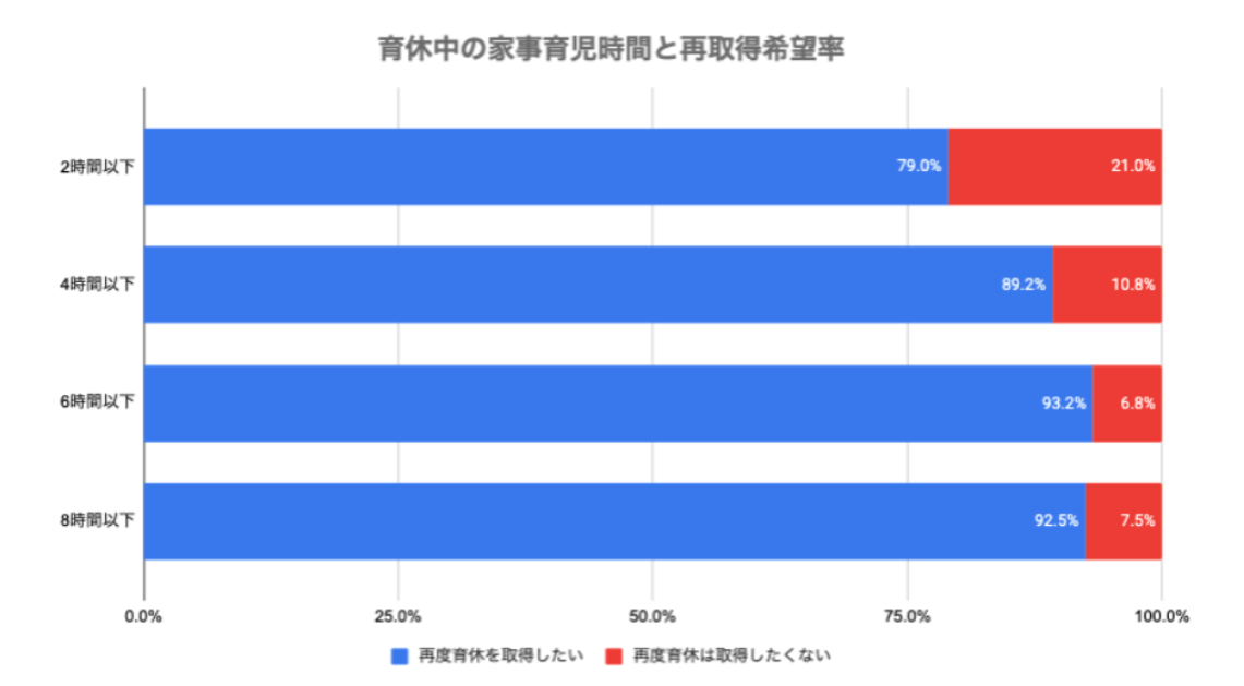 育休取得率を伸ばすためには、取得しやすい環境を整えることや、取得期間を伸ばせる施策以外にも、男性が育休取得期間中の家事育児時間を増やすための夫婦感のコミュニケーション、事前のノウハウ提供などが大切なことがわかります。