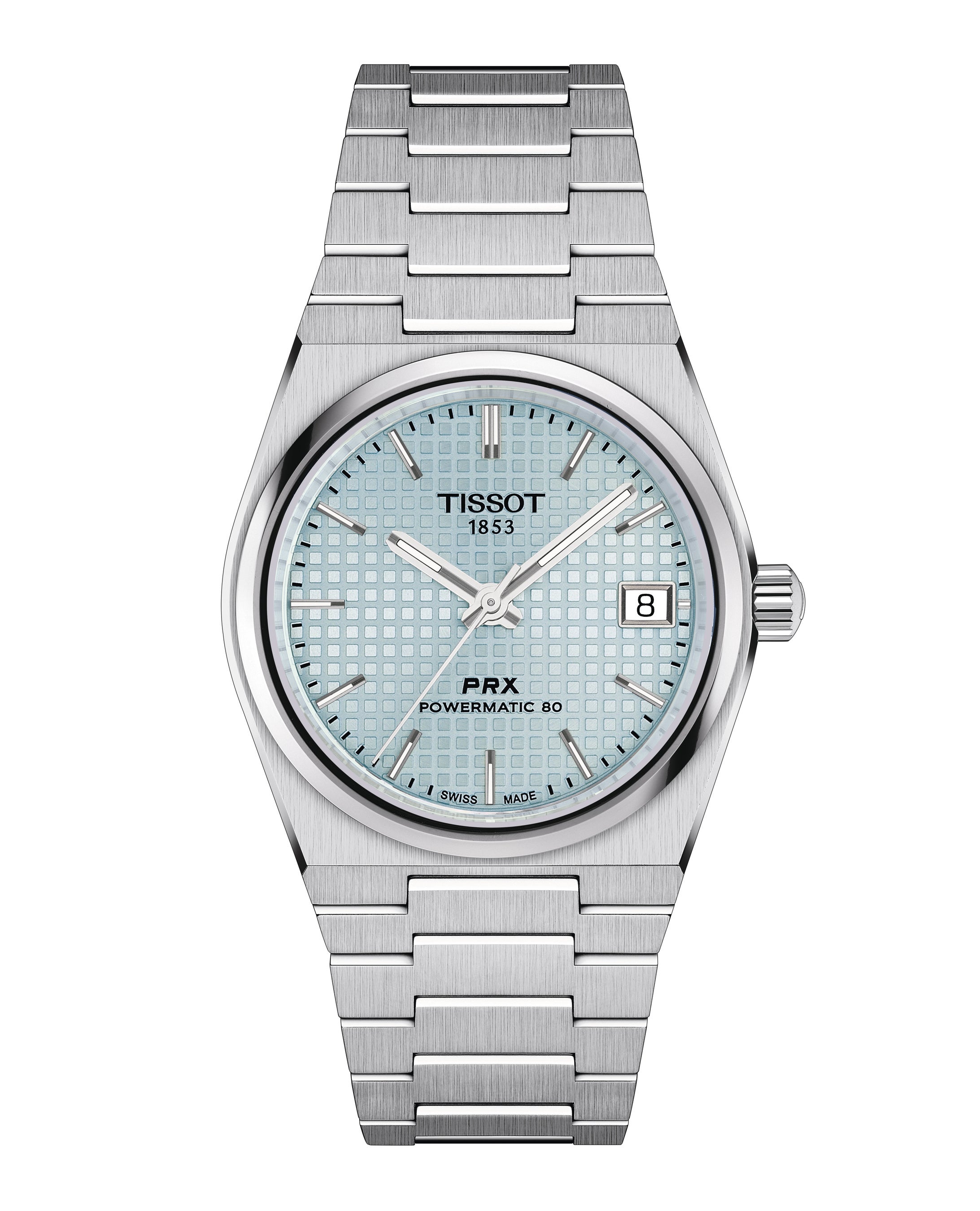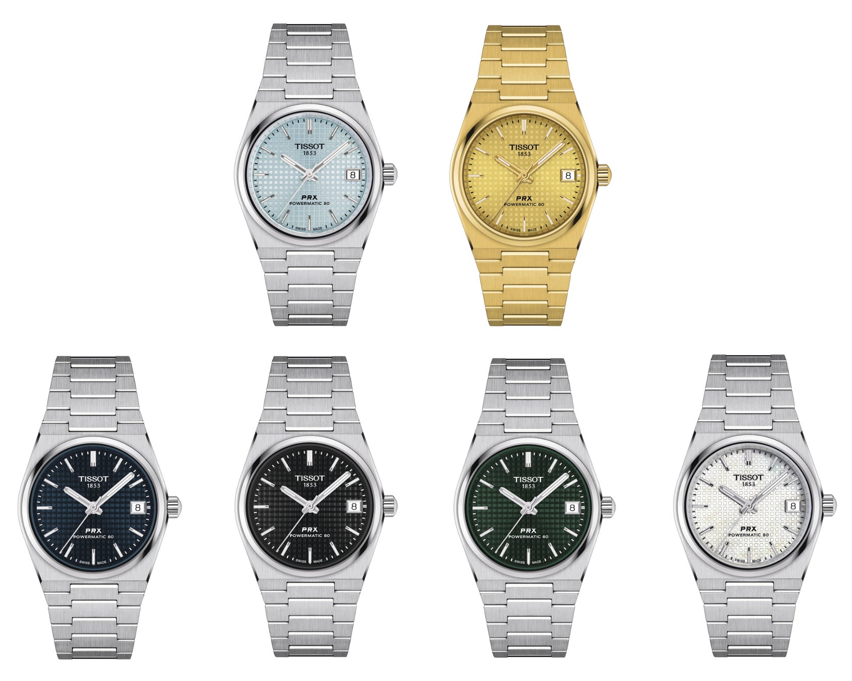 ティソ PRX 35mm パワーマティック 80コレクションには、ブラック、グリーン、ブルー、ホワイトマザーオブパールのベーシックな文字盤カラーに加え、魅惑的なアイスブルーと輝くようなゴールドが登場します。
