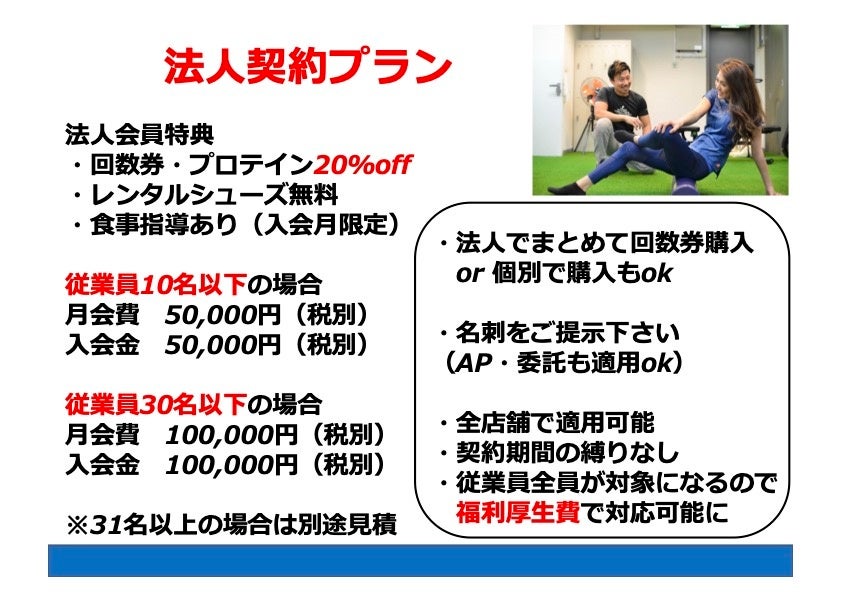 パーソナルジムで法人契約をすることで、従業員(アルバイト・パート・委託含む)が回数券を安く20%引きにて利用可能となります。