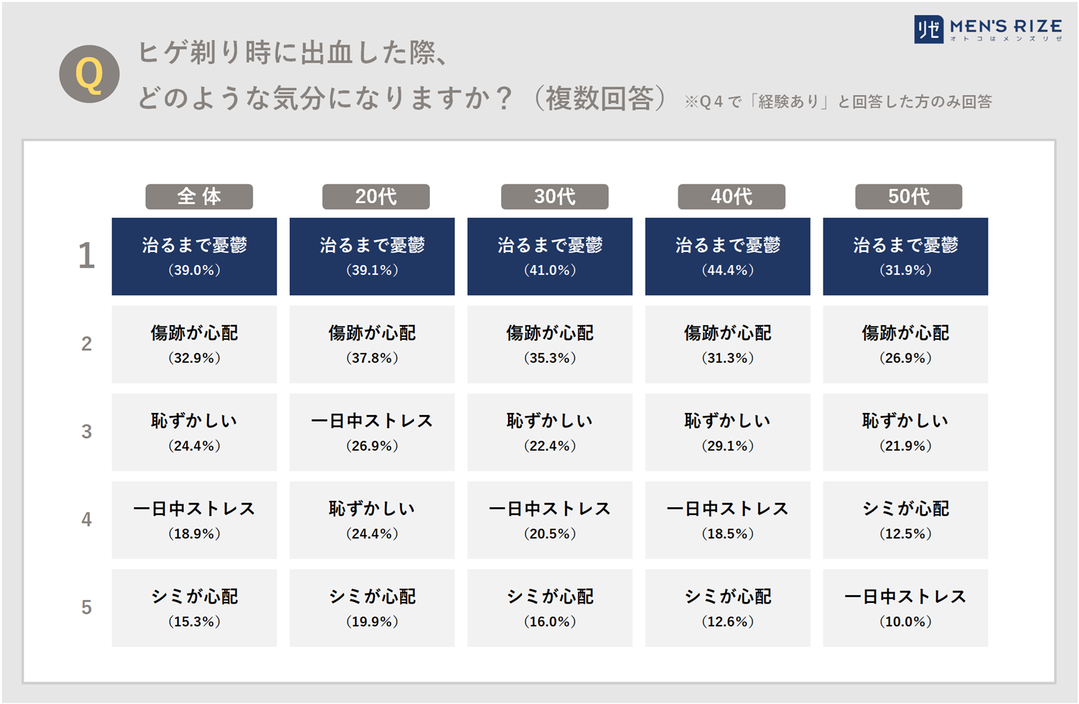 ・ヒゲ剃り時に出血した際の気分:①治るまで憂鬱(39.0%)②傷跡が心配(32.9%)③恥ずかしい(24.4%)