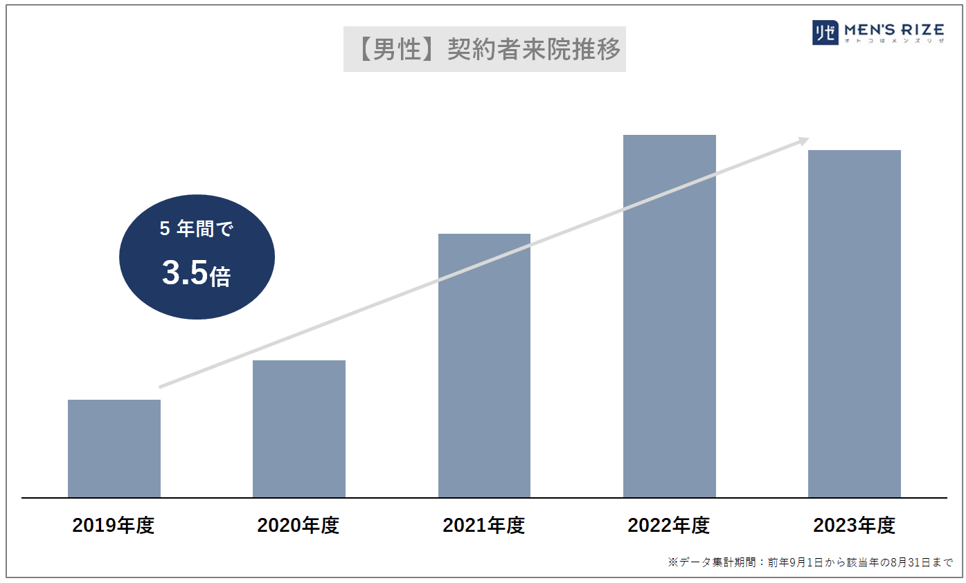 実際に当院で医療脱毛を契約した男性患者さま数(推移)を「コロナ前後の5年間(2019年度から2023年度)」で比較すると、3.5倍に増加しています。