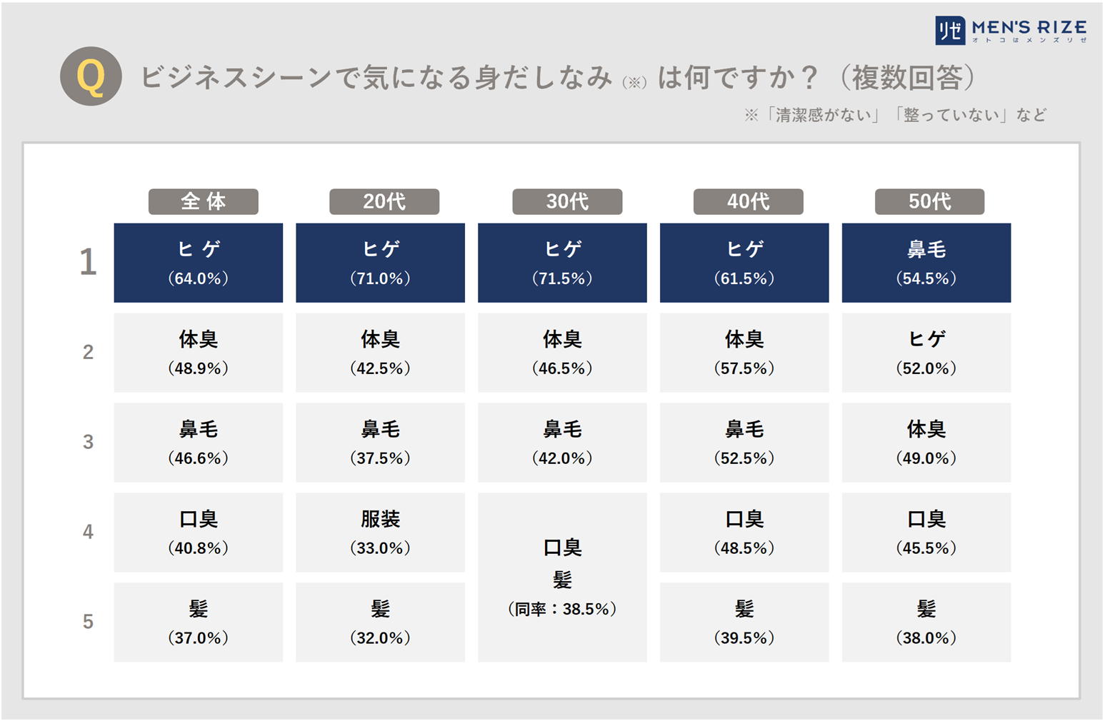 ①ヒゲ(64.0%)②体臭(48.9%)③鼻毛(46.6%)④口臭(40.8%) ⑤髪(37.0%)順