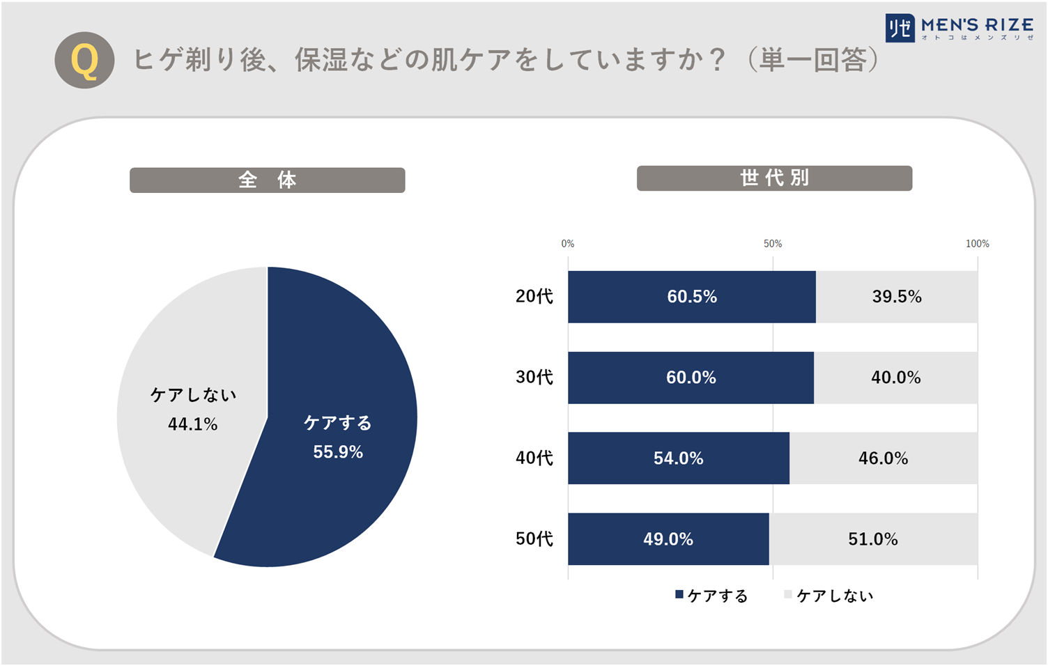 ●ヒゲ剃り後に「肌ケアをする」男性は半数以上(55.9%)いる反面、4割以上が「特にケアをしていない(44.1%)」