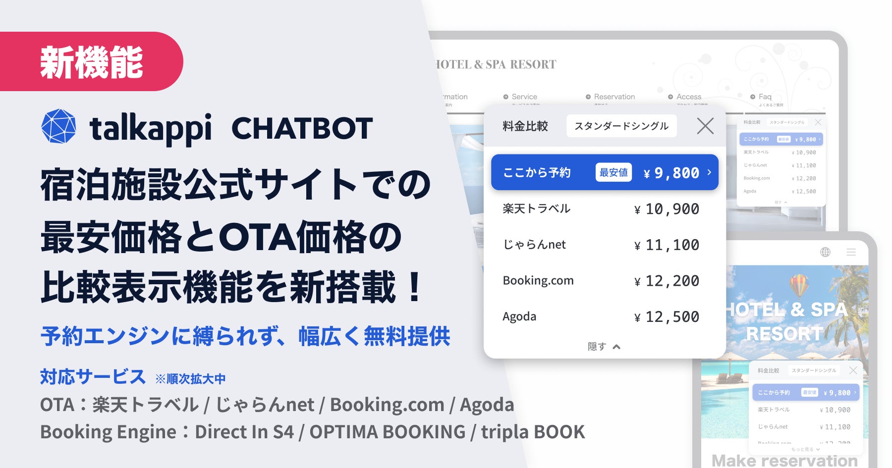 宿泊施設公式サイトでの最安価格とOTA価格の比較表示機能をtalkappi CHATBOTに新搭載!