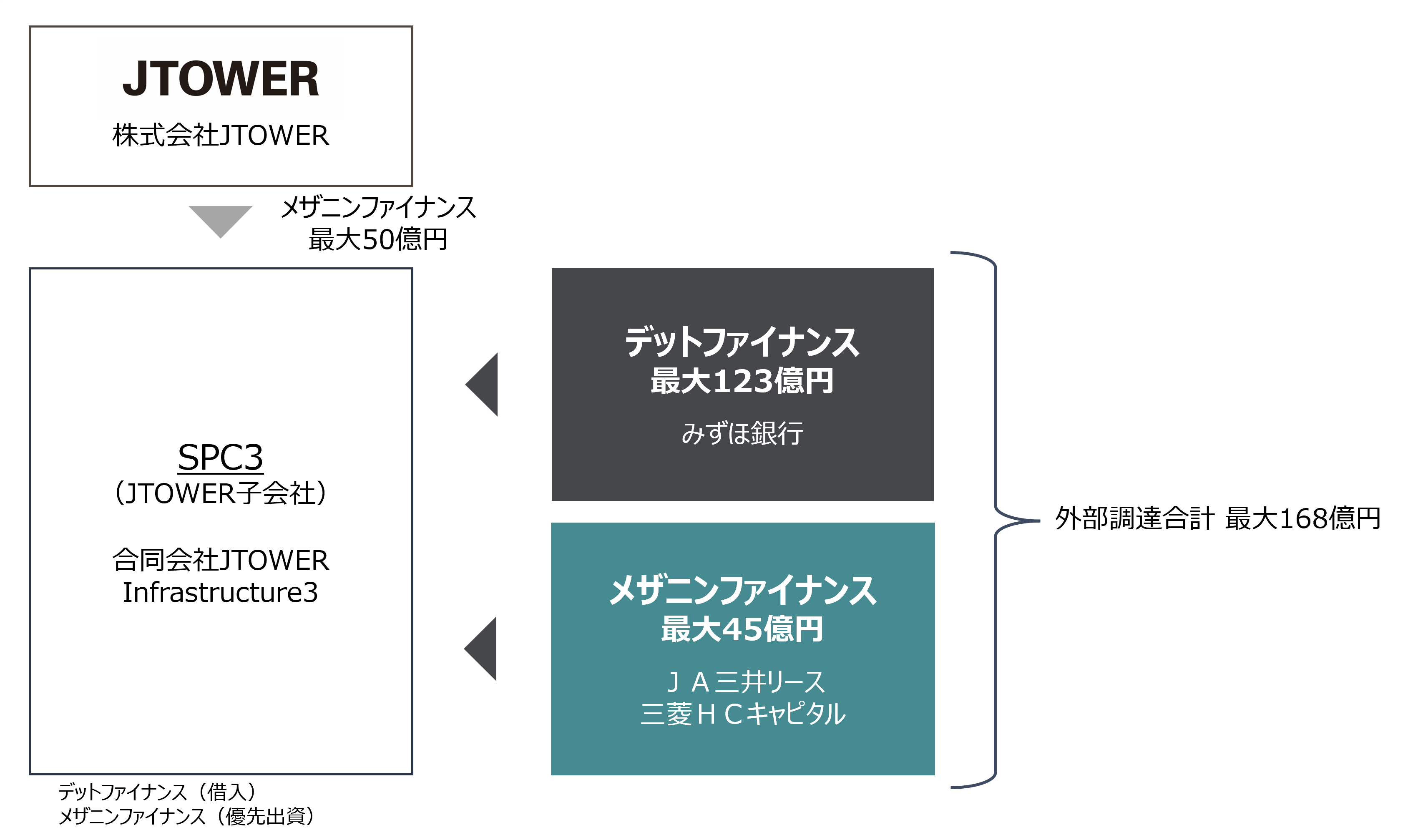 本件にかかわる外部からの資金調達は最大168億円となり、みずほ銀行*³からの借入(デットファイナンス)とJA三井リース*⁴および三菱HCキャピタル*⁵からの優先出資(メザニンファイナンス)によって構成されています。いずれも2023年9月にJTOWERの子会社として設立されたSPC(特別目的会社)である「合同会社 JTOWER Infrastructure3」に対して行われるものです。また今後、JTOWERから本子会社に対して最大50億円の優先出資を実行する予定です。