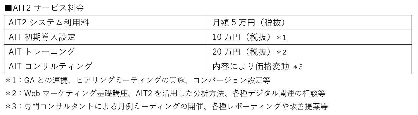 「AIT2」では、最新の「GA4」との連携に対応するとともに、傾向分析がしやすいようビジュアライゼーション(グラフ)を向上させます。また新たに、企業様・団体様向けのWebマーケティング支援サービスも開始し、Webマーケティングの基礎から具体的な分析方法などを学ぶ「AITトレーニング」をはじめ、専門コンサルタントによる「AITコンサルティング」などでDX推進をサポートいたします。