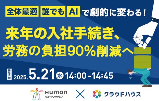 共催セミナー「『全体最適』 『誰でも』 『AI』で劇的に変わる!来年の入社手続き、労務の負担90%削減へ」をクラウドハウスが開催|株式会社Techouse×ヒューマンリソシア株式会社|5月21日(水)