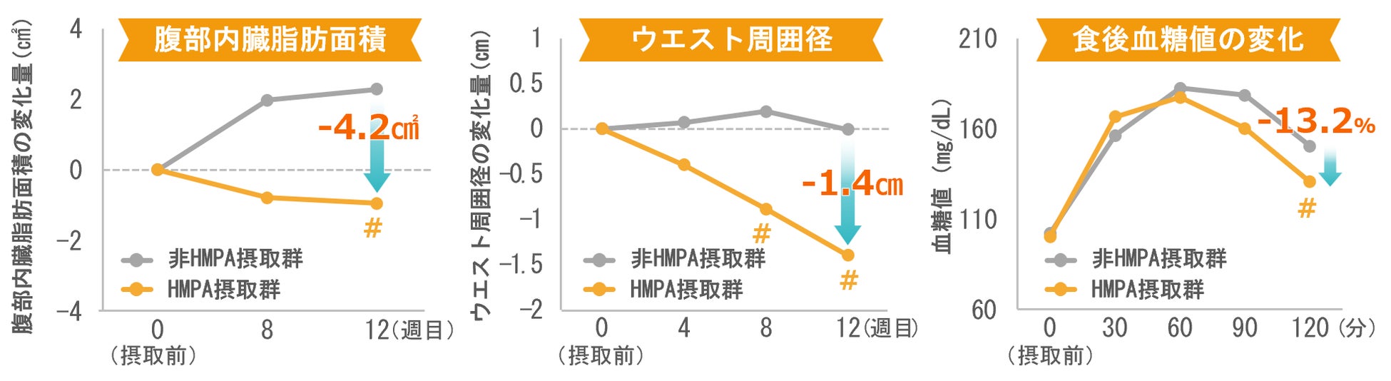 BMI23-30kg/㎡の健康的な男女(20~64歳)74名を対象に、HMPAを服用している人との比較で「腹部内臓脂肪面積」と「ウエスト周囲径」の変化を12週にわたって調査。結果として、腹部内臓脂肪面積で「-4.2㎡」、ウエスト周囲径で「-1.4cm」の効果が報告されました。