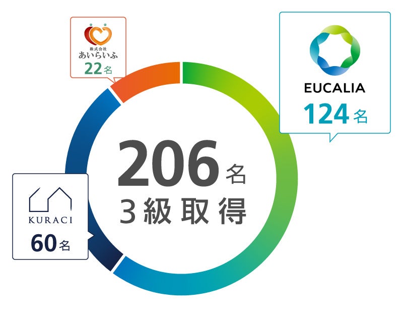 DEI推進のため、株式会社JobRainbowが提供している「D&I検定」受検をユカリアグループ全体で進めています。2023年12月までに、現在公開されている「D&I検定3級」を株式会社ユカリア全社員および、グループ会社の株式会社あいらいふ、株式会社クラーチの社員合わせて206名が受検しました。今後もユカリアグループ全体で「D&I検定3級」取得を推進してまいります。