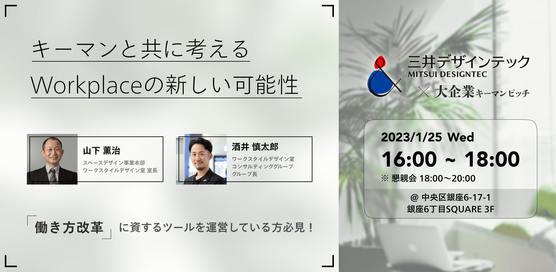 本イベントでは三井デザインテックのスペースデザイン事業本部ワークスタイルデザイン室の方々をお招きいたします。ワークスタイルデザイン室は、「働き方改革」コンサルティングを通じて、日本の企業を世界に誇れる企業に成長させ、そこで働くワーカーと、その周囲の人々を幸せにすることを目標に掲げております。