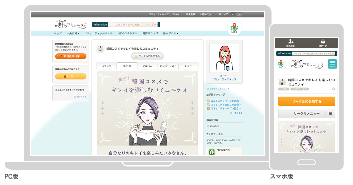 「集合!韓国コスメでキレイを楽しむコミュ二ティ」は、韓国コスメがテーマのファンコミュニティです。参加者は、韓国コスメの魅力や商品、美肌やメイク方法について性別を問わず対話しながら、韓国コスメをより楽しむことができます。