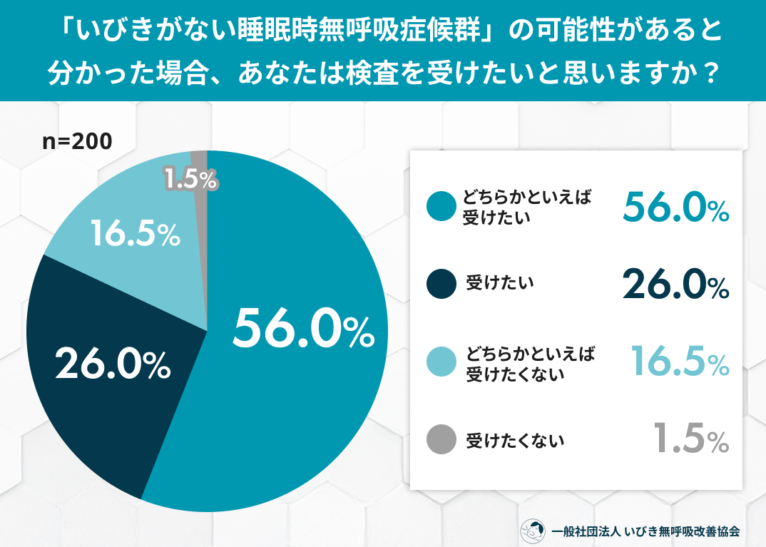 睡眠時無呼吸症候群(SAS)において、いびきはあくまで「空気の通り道が狭くなっている」というサインの一つに過ぎません。中にはいびき音が小さくても、実際には何度も呼吸が止まり、脳や体が酸欠状態に陥っているケースがあります。今回の調査で、8割以上の方が「可能性があるなら検査を受けたい」と回答されたことは非常に心強い結果です。「自分はいびきをかかないから関係ない」と選択肢から外してしまうのではなく、原因不明の倦怠感や日中の眠気がある場合は、ぜひ一度睡眠の状態を疑ってみてください。ご家族の「息が止まっているよ」という一言は、健康を守るための最も貴重なアドバイスです。