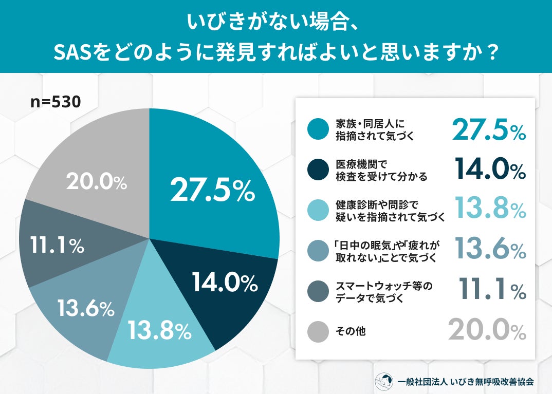 いびきがない場合の発見方法として、約4人に1人(27.5%)が「家族・同居人の指摘」を挙げる