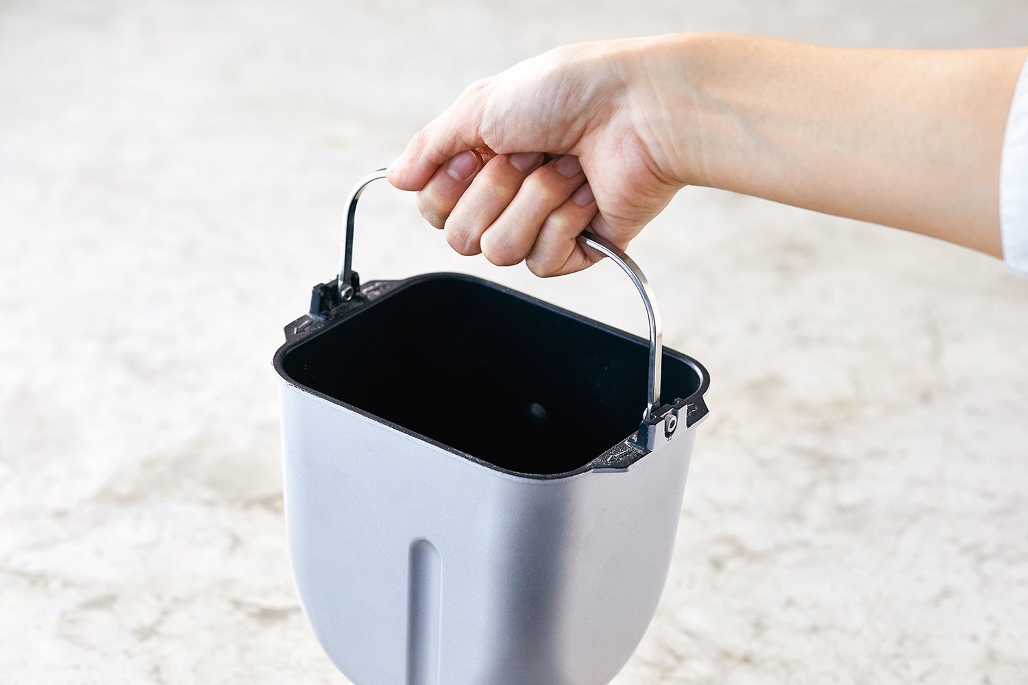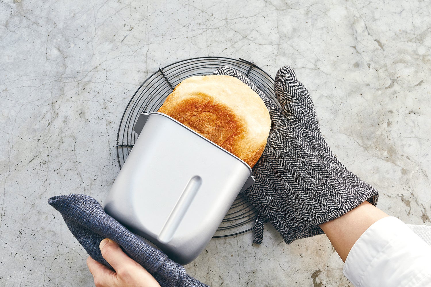キッチンで使う家電は「大きい」「幅をとる」ことが悩みのひとつ。[コンパクトベーカリー]はその名の通り、コンパクト。幅約20.5cmなので棚やワゴンにも置けるサイズです。操作性の良さを保ちながら、デザイン性も追求。カラーは、存在感を放ち過ぎないツヤを抑えたマットな質感。そして裁ち落としたようにフラットで直線的な形状は、美しさだけでなく、キッチンの角や壁面にも置きやすいように設計。バケツの取手のような垢抜けない本体ハンドルは追放。本体底から指をかけて持ち上げられるようにしました。インテリアの一部としても置いておきたくなるようなホームベーカリーを目指しました。