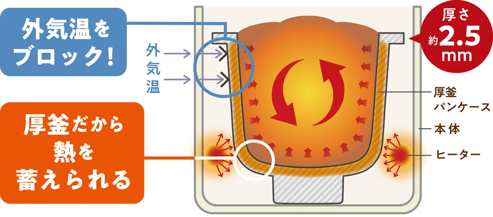 高級炊飯器のような、厚さ約2.5mmのパンケース。ヒーターからの熱を蓄え、パンケース全体に熱を行き渡らせることができます。同時に、外気の影響も受けにくいので、パンケース内の温度も安定。パンのおいしさを左右する焼減率(※)は約10%と適正値。焼きムラが起きにくく、いつでもおいしいパンを焼き上げます。