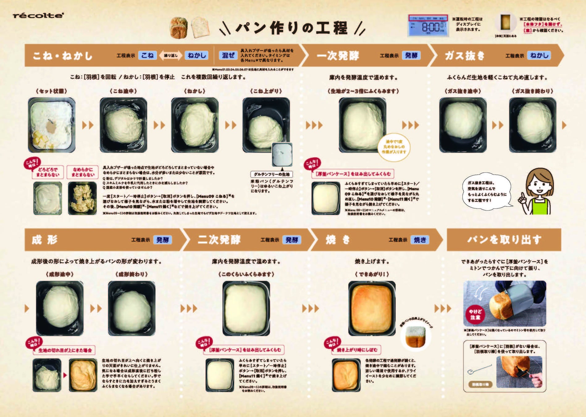 はじめてホームベーカリーを使う人にも分かりやすい、ガイドシートも付属。手元に置いてパン作りができるよう、汚れにくいラミネート加工。A3二つ折りで、文字も大きく読みやすく、工程写真も豊富。もし失敗しても原因が理解しやすくなっています。