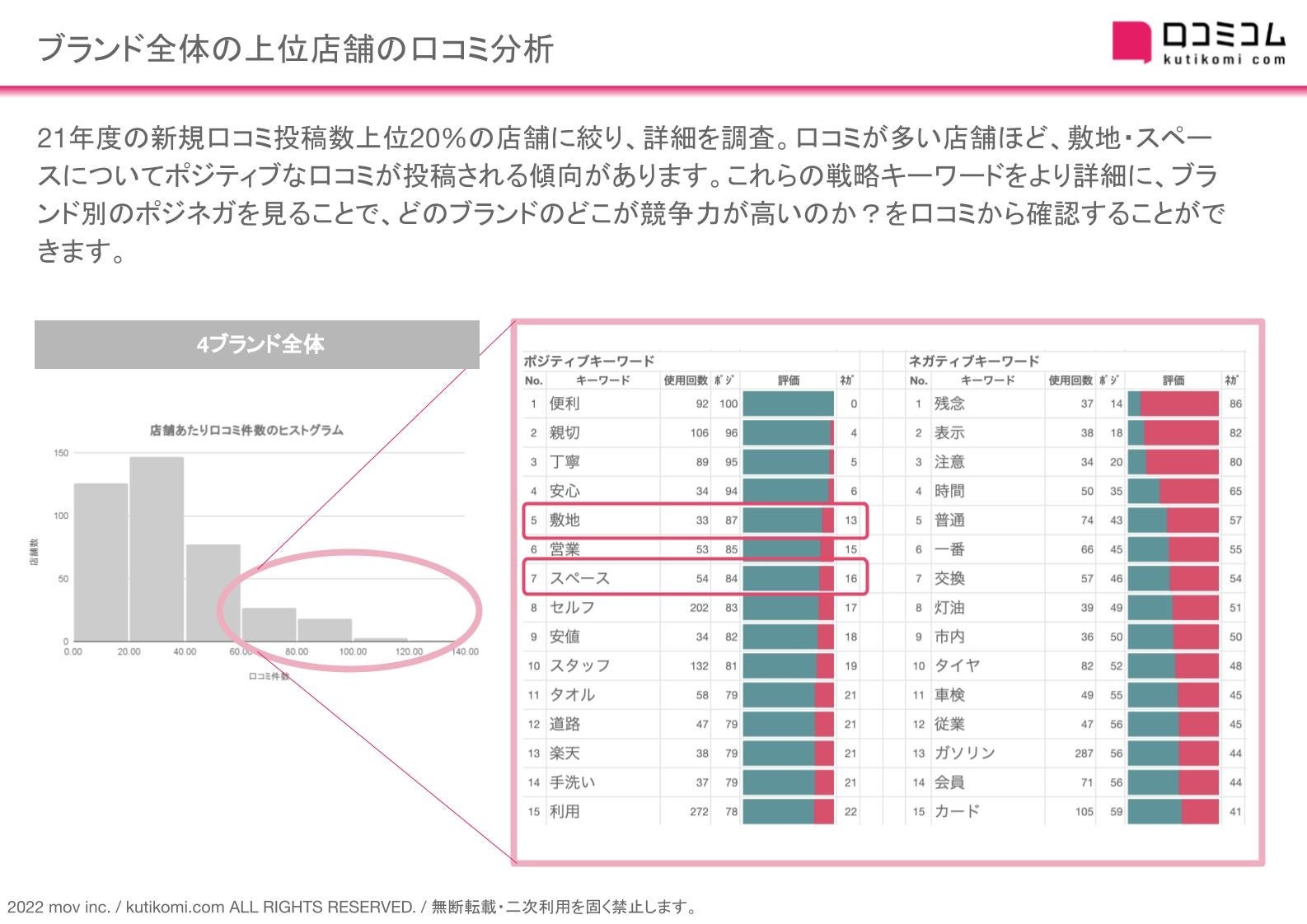 ブランド全体で2021年度の新規口コミ投稿数上位20%の店舗に絞り、詳細を調査しました。口コミが多い店舗ほど、「敷地」「スペース」についてポジティブな口コミが投稿される傾向があります。