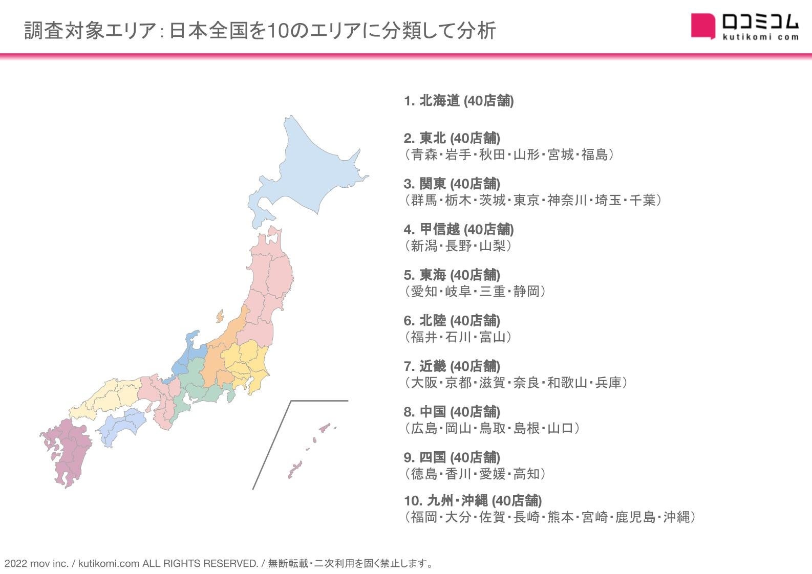 今回は、日本を10のエリア(北海道・東北・関東・甲信越・東海・北陸・近畿・中国・四国・九州沖縄)に分類して、各エリアで4ブランド毎に10店舗合計400店舗のガソリンスタンドを対象に総数37,000件超の口コミを分析しました。