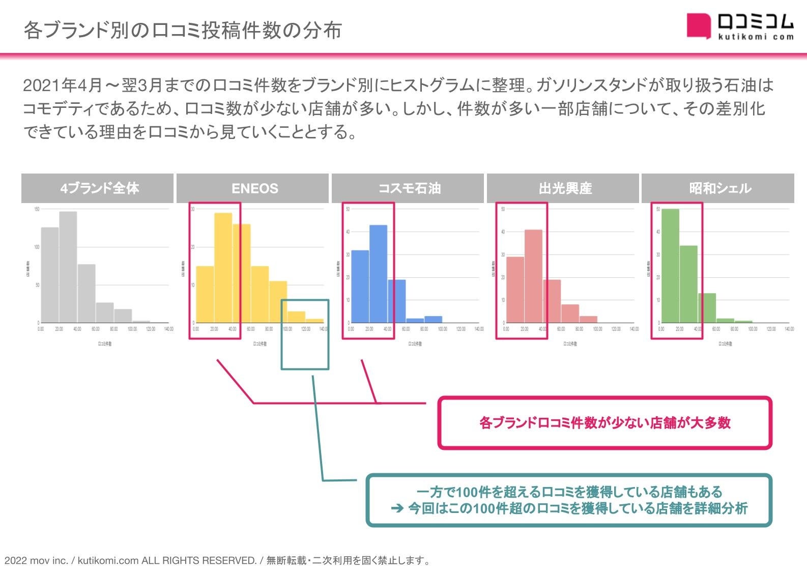 口コミ件数をブランド別にヒストグラムに整理。ガソリンスタンドが扱う石油はコモディティであるため、口コミ数が少ない店舗が多い。しかし、一部店舗については口コミが多く寄せられています。その差別化できている理由を口コミから見ていきます。