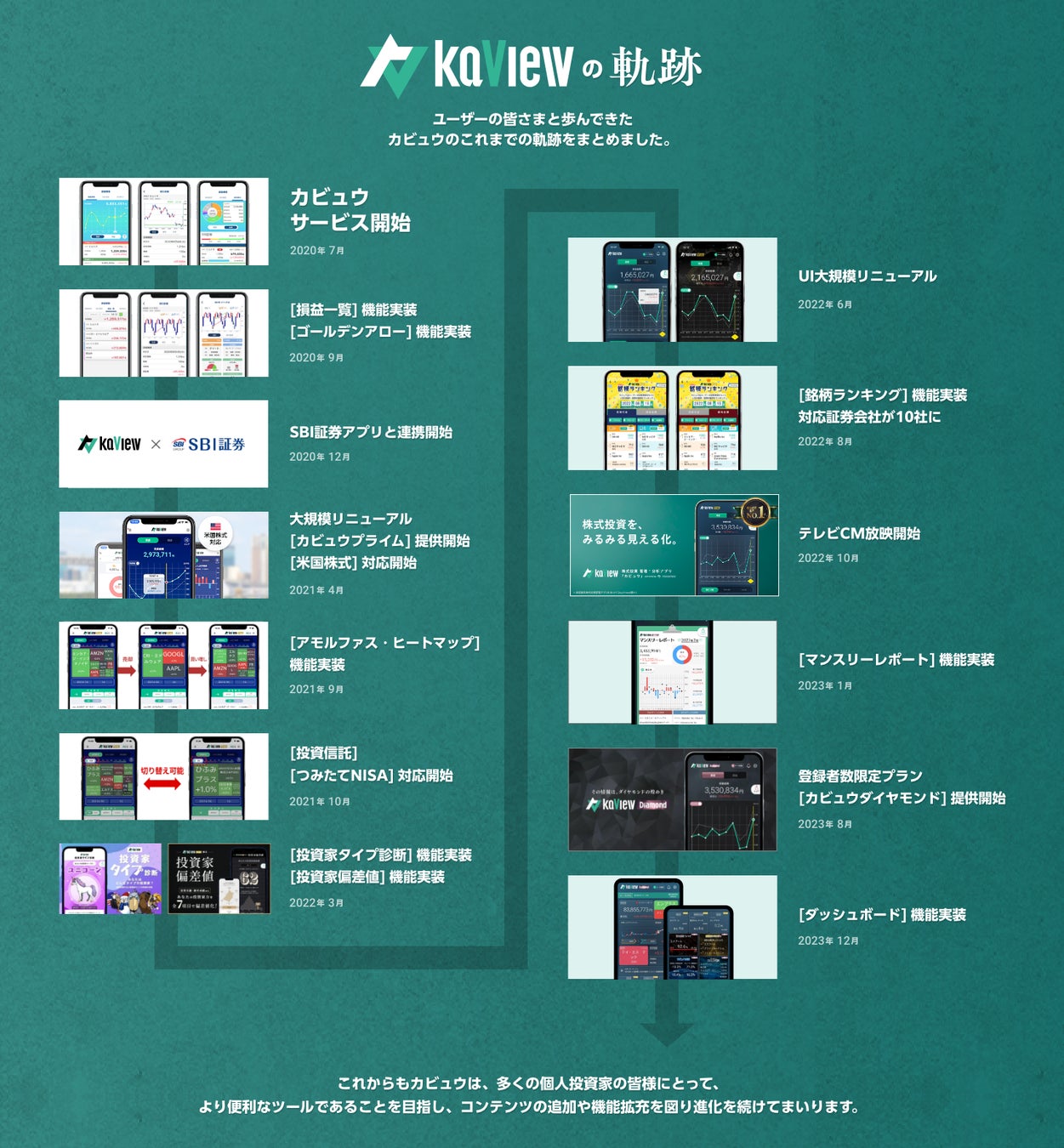株式投資 管理・分析アプリ『カビュウ』は、2020年7月のサービス開始以来、約3年半にわたり、投資家さまがより便利に、より簡単に投資管理・分析ができるように、様々な独自コンテンツをリリースしてまいりました。