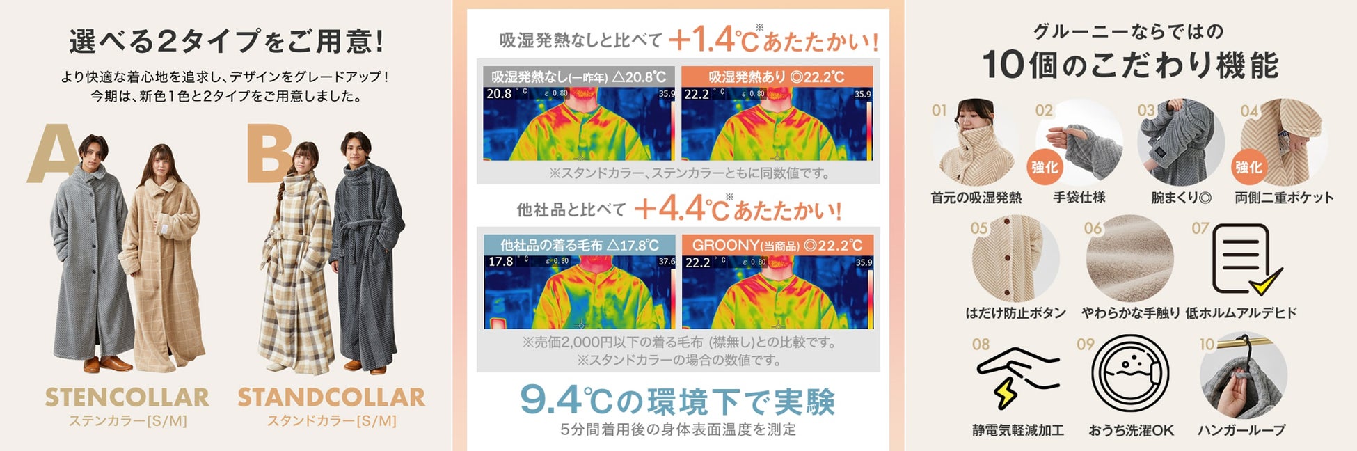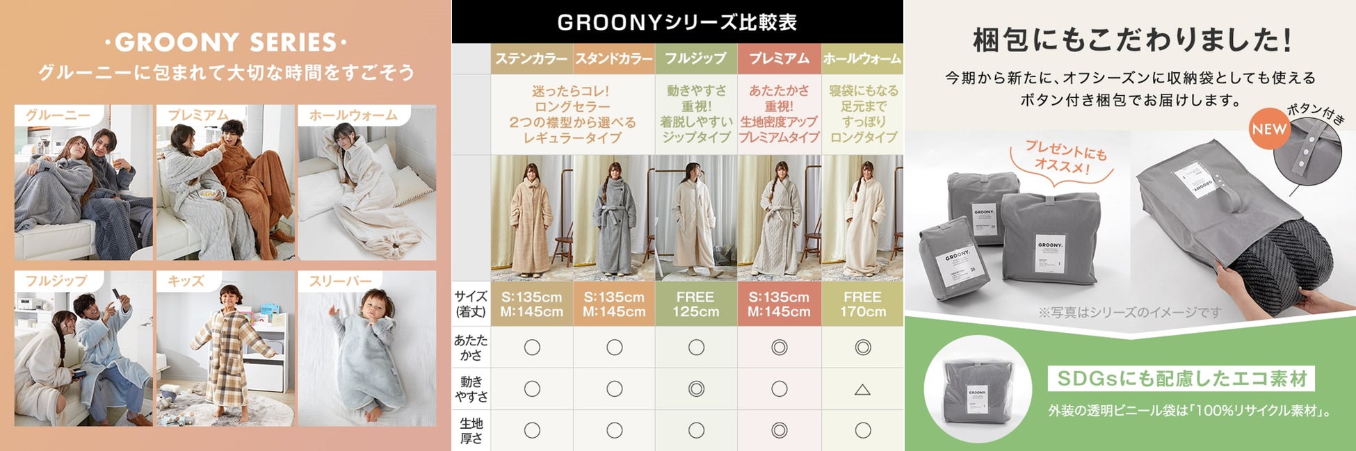 そんな圧倒的人気を誇る冬のあったかルームウェアGROONYがさらに進化して、今年も販売を開始!ご愛用のお客様からいただいた声をもとに改良を加え、昨年より機能性や着心地がアップいたしました。