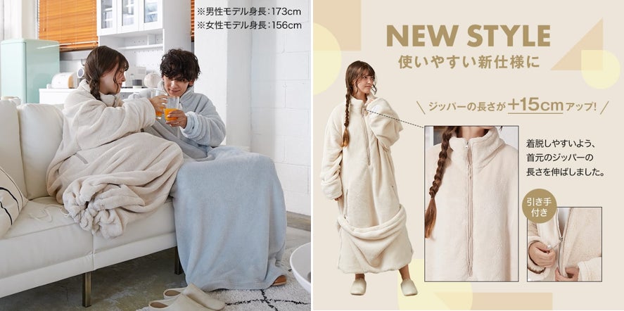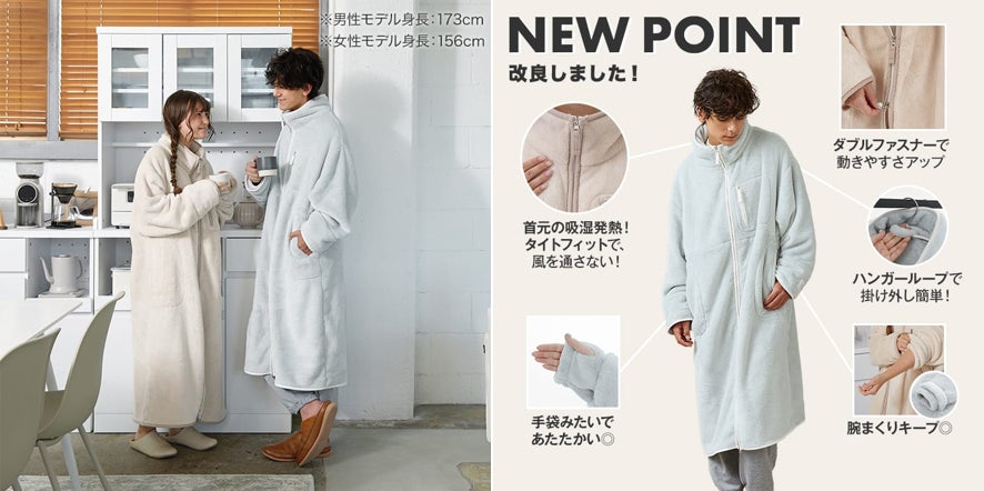 首・手首・足元まですっぽり包み込む寝袋型デザインのロングタイプ。昨年よりもジッパーの長さを15cmプラスし、脱ぎ着がしやすくなりました。ソファやベッドでのまったりタイムにおすすめのアイテムです。