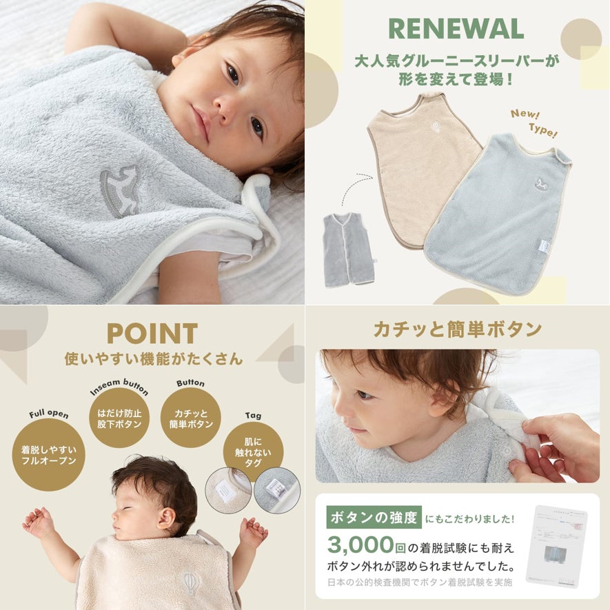 今年は形を変えて大幅リニューアル!着脱しやすいフルオープン仕様になり、月齢やシーンに合わせて着せ方を選ぶことができます。股下ボタンで、寝ている間に動いても、はだけにくく、赤ちゃんの睡眠を邪魔しません◎