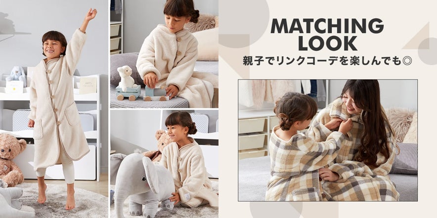 性別を問わず着用できるベーシックカラーで、大きめのボタンとパイピングのアクセントがきいたおしゃれなデザインが特徴。冬のお遊びタイムから、お布団を嫌がってしまう子の睡眠時のサポートまで、幅広いシーンで大活躍します!親子でリンクコーデができる嬉しいキッズサイズで展開します。
