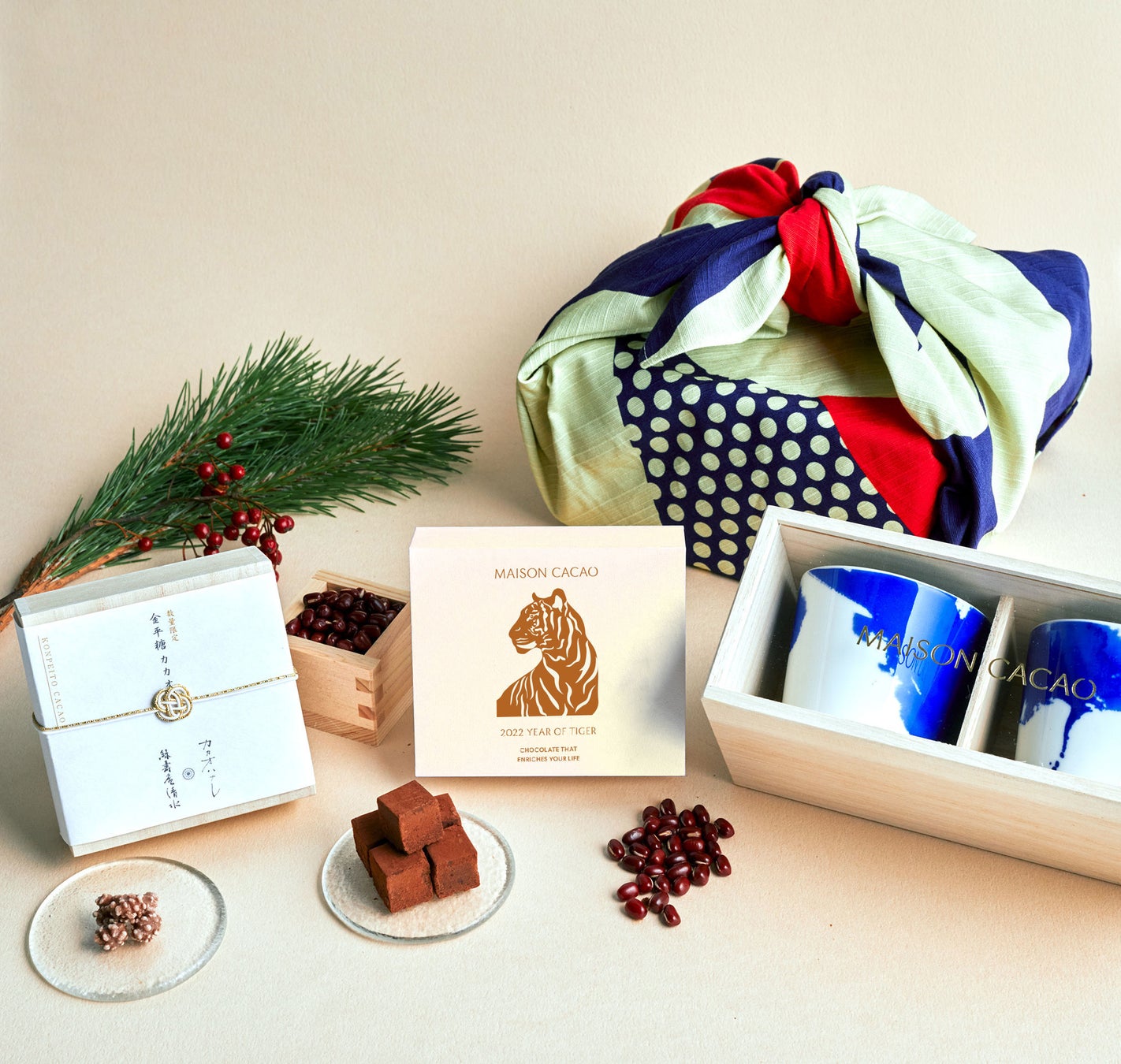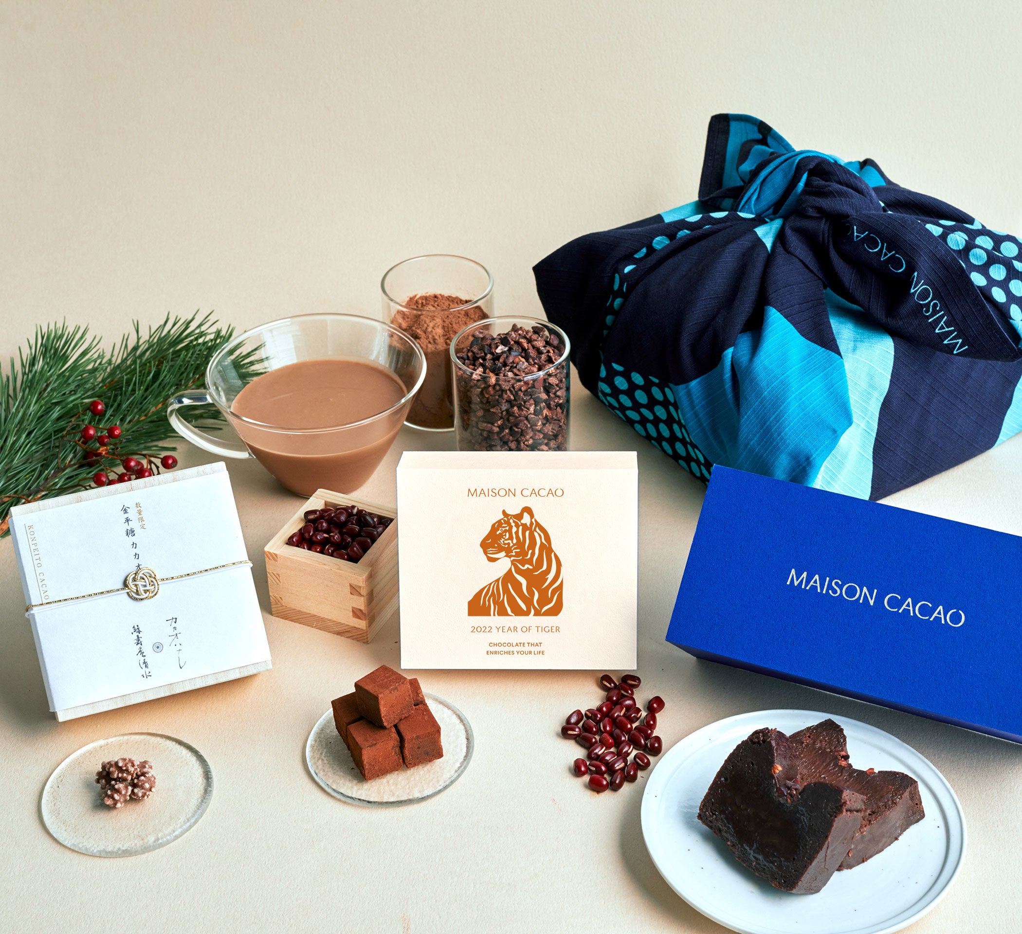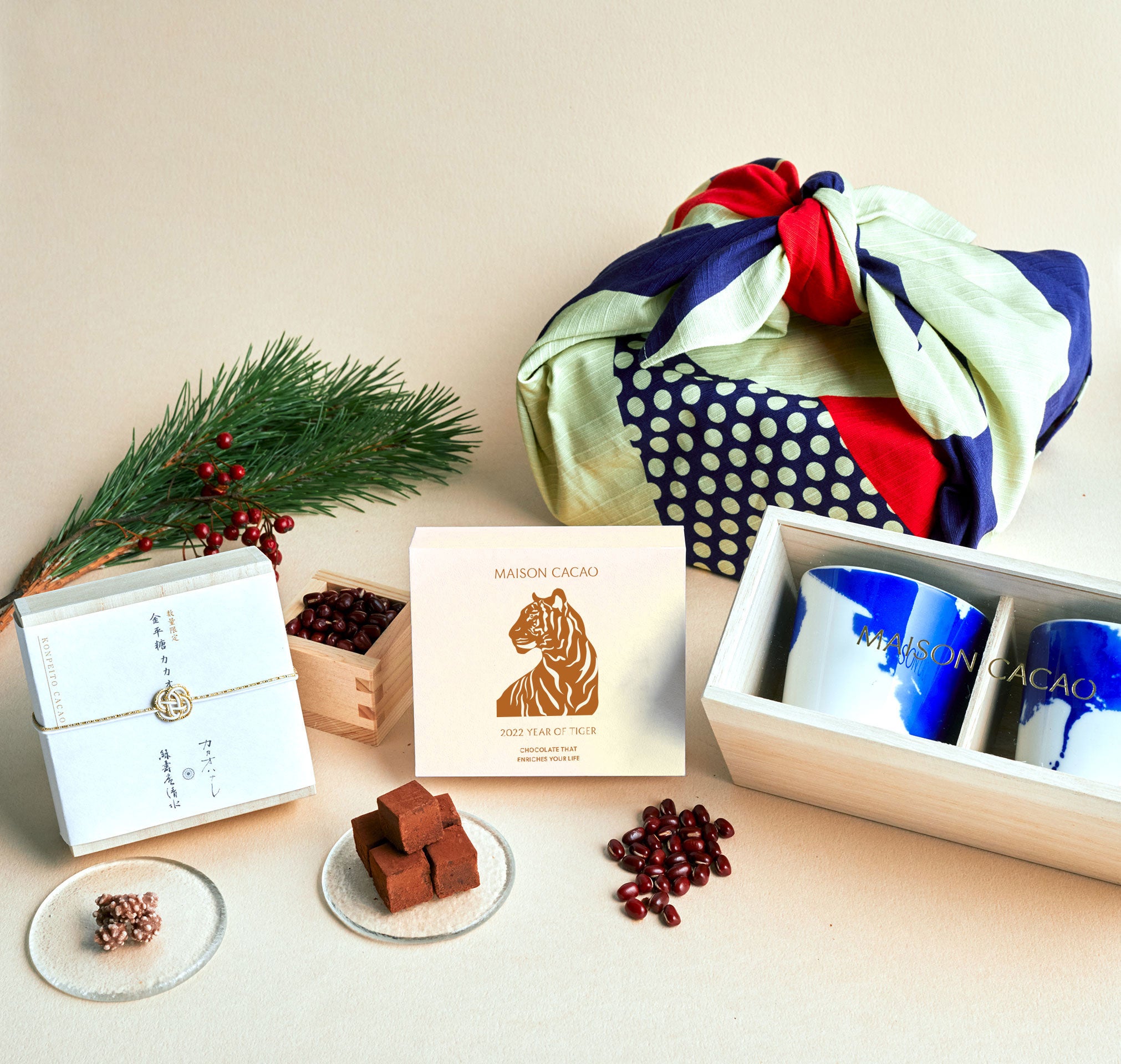どちらにも2022年の干支 ”寅”をイメージした限定のあんこの生チョコレートと、1年の無事を祝う縁起菓子のカカオニブ金平糖を入れました。加えて和の福袋には、日本の伝統工芸である伊万里焼の窯元「畑萬陶苑」と協働したオリジナルの蕎麦猪口が2個セットで入っています。洋の福袋には生ガトーショコラやホットチョコレートなど、人気の洋菓子を詰め合わせました。