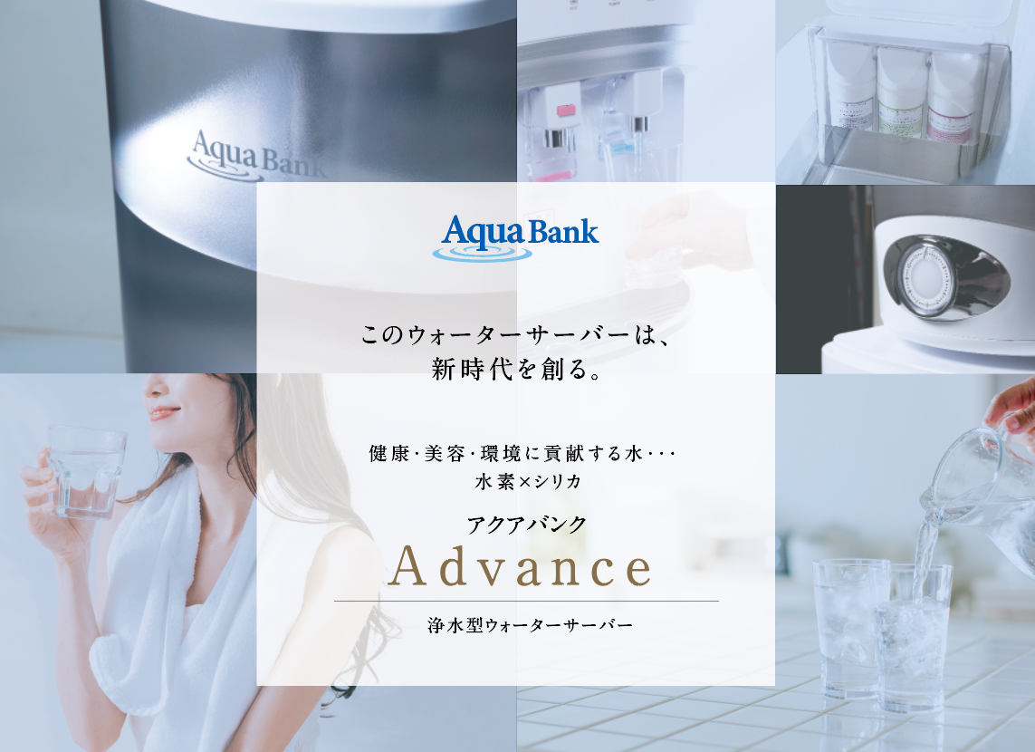 水道水を注ぐだけで簡単に「ミネラル・シリカ水素水」をつくることができるウォーターサーバー、「アクアバンクAdvance」。本商品は『水にこだわる本物志向のお客様にワンランク上のサービスを』をコンセプトに誕生いたしました。水道水を浄水するだけでなく、不足しがちなミネラル成分のカルシウムやマグネシウム、美容業界でも注目度が高いシリカ、アスリートに根強い人気のある水素といった、体に良いといわれる成分を含んだ水がご自宅でお楽しみいただけます。
