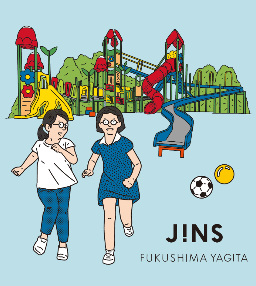 イラストレーターYunosuke氏を起用。福島市にある松川工業第一公園の大型複合遊具「まつかわタワースライダー」とメガネをかけて遊ぶ子ども達をイメージした描き下ろしグラフィックが店内を彩ります。